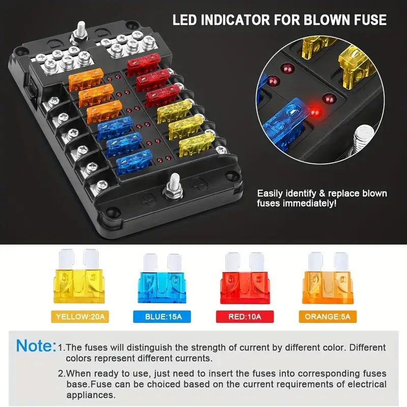 12 Volt 12-Way Fuse Block with LED Indicators and Fuses