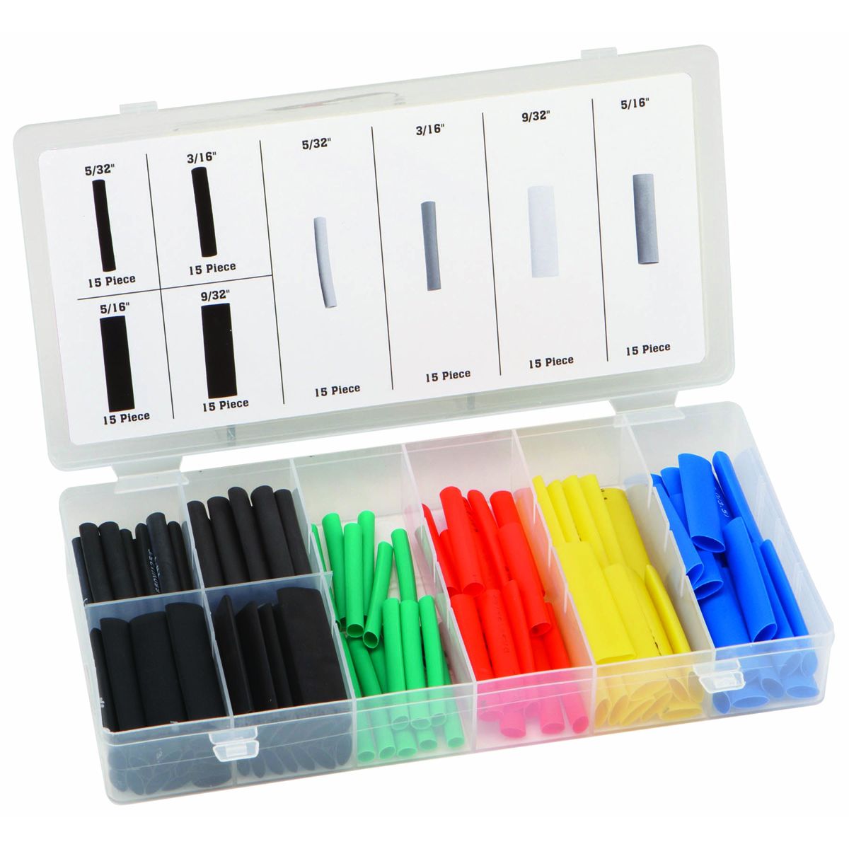 This heat-shrink tubing set includes five different colors with 15 pieces of each size and color combination. Use the tubing set to color-code positive, negative and ground wires for quick and easy identification. This heat shrink tubing set comes in a convenient divided container to keep the pieces organized and easily portable.