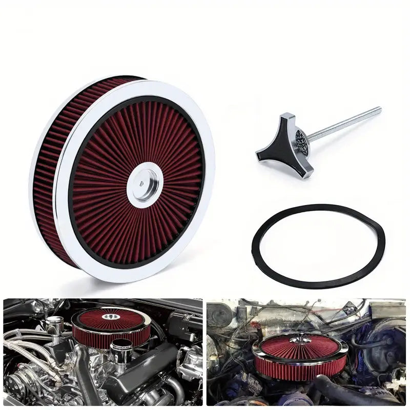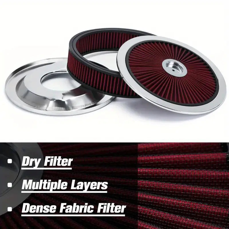 Enhance your engine's performance with our 14" x 3" Round Red Washable Air Cleaner, complete with a sleek chrome trim. Keep your vehicle running smoothly and efficiently with this washable air cleaner that can withstand multiple uses while maintaining its vibrant red color. Upgrade your ride today.