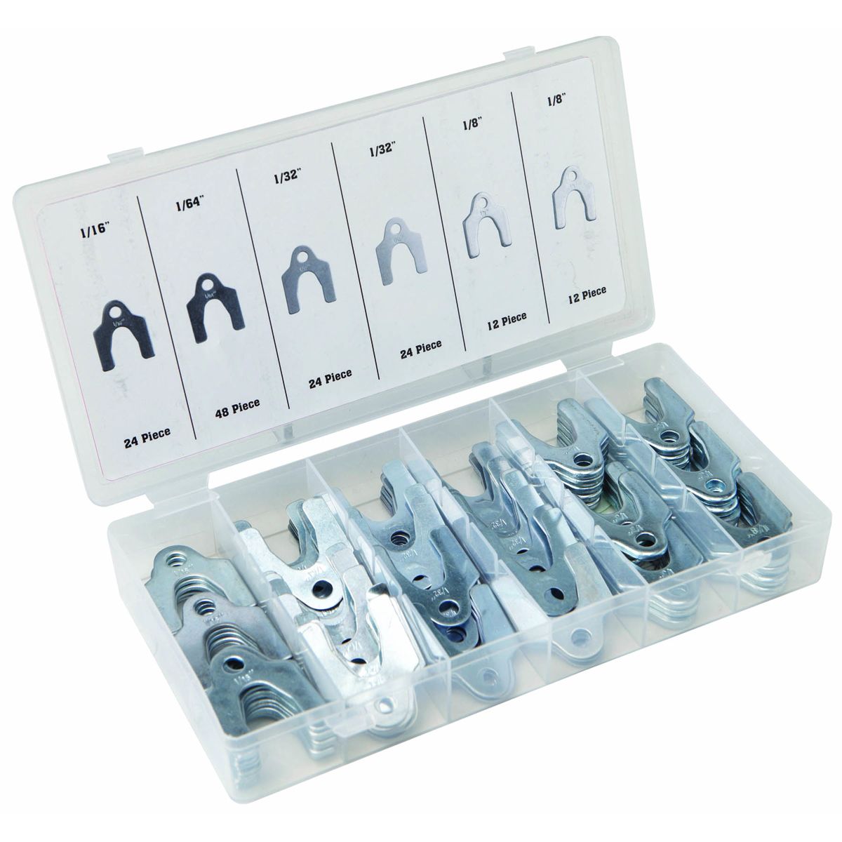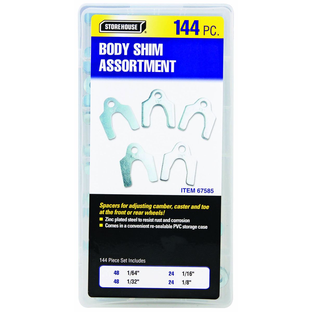 These body shim spacers are essential for any car enthusiast or professional mechanic to shim body parts, creating even gaps and creases. They can also be used to adjust camber, caster and toe on front or rear wheels. Zinc plated to resist rust and corrosion, this assortment of body shims includes a range of sizes to accommodate a variety of automotive applications. Durable and easy to use, this handy set comes in a convenient PVC storage case for organization.