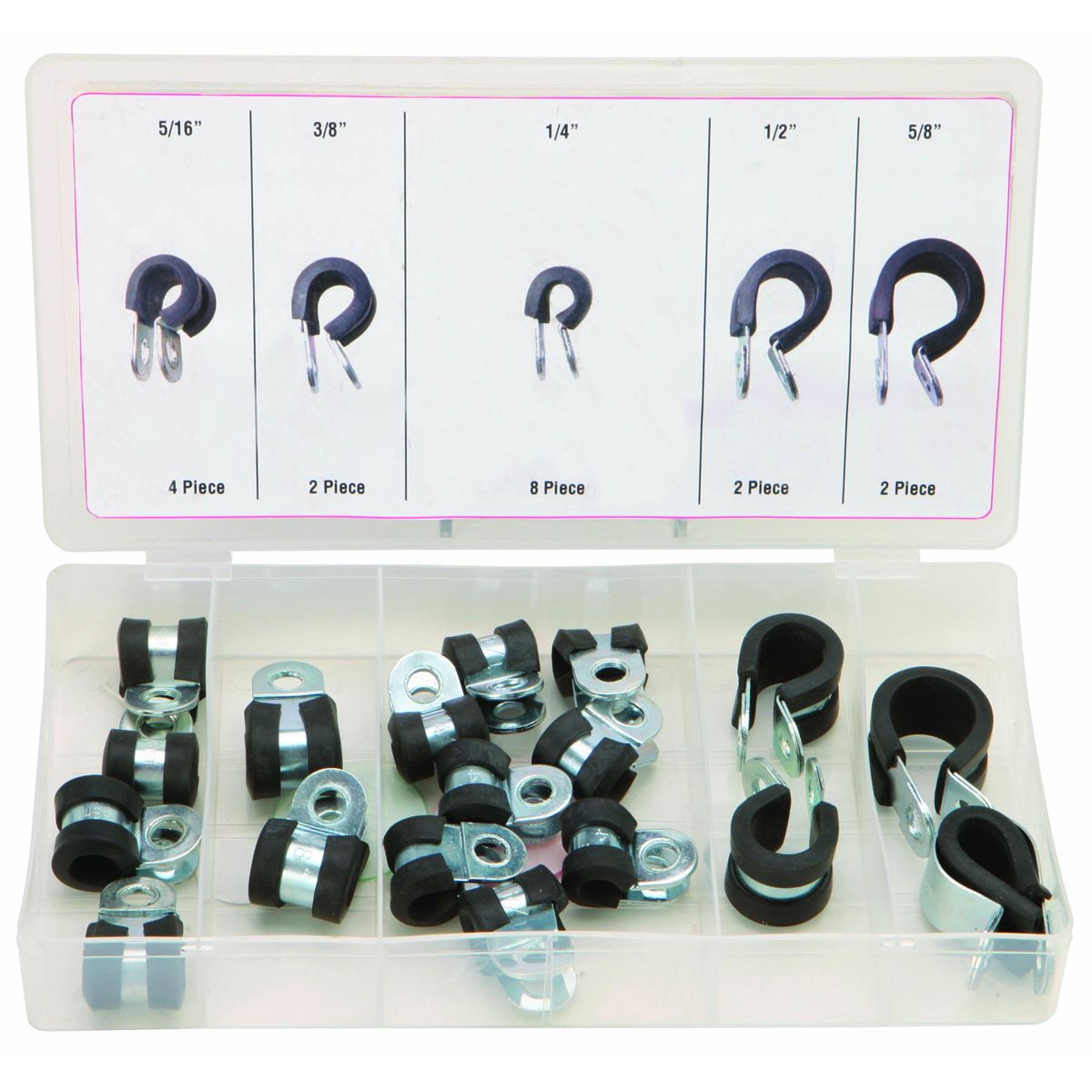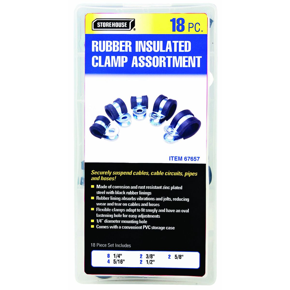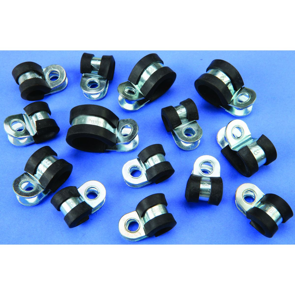 These insulated clamps have a rubber liner to dampen vibration and reduce wear on tubing, cables and hoses. The clamps are made from durable zinc-plated steel. The set comes organized in a PVC storage case.