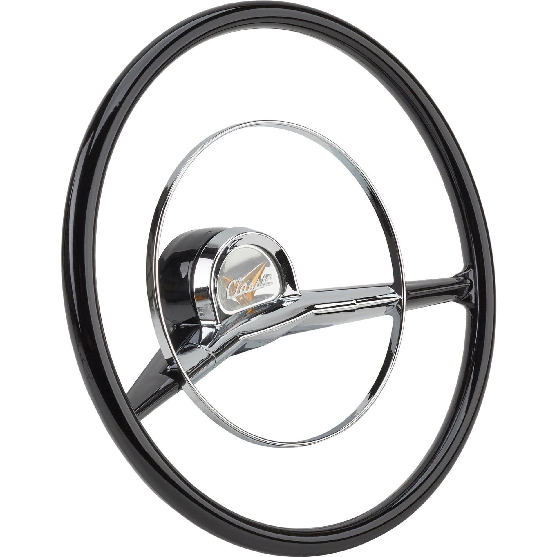 Made to fit to the original steering column using all the original horn, nuts, and turn signal switch parts. The American-Retro wheel comes complete with a chrome horn ring and a center cap. Installation is easy - just bolt it on! Finished in black. For other colors, simply paint to match your vehicle.