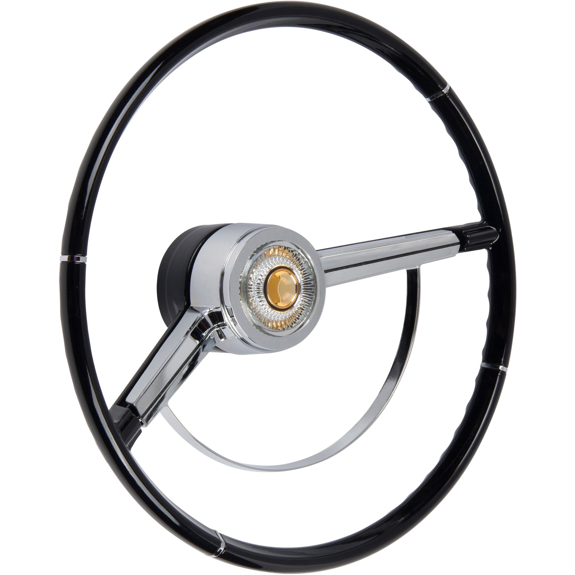 Made to fit to the original steering column using all the original horn, nuts, and turn signal switch parts. The American-Retro wheel comes complete with a chrome horn ring and a center cap. Installation is easy - just bolt it on! Finished in black. For other colors, simply paint to match your vehicle.
