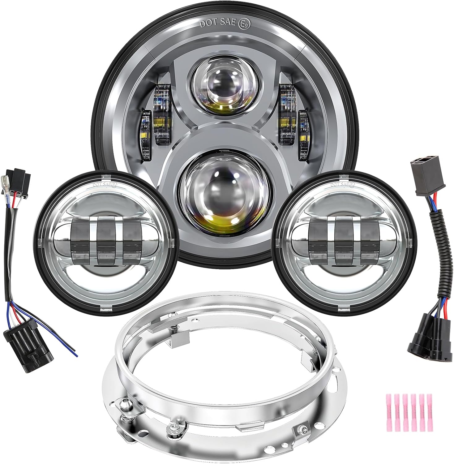 This 7" motorcycle headlight comes with 4.5" spot/fog lights, providing increased visibility while riding. Expertly crafted with durable materials, this headlight is designed to withstand harsh weather conditions and long rides. Illuminate your path and enhance your safety with this high-quality motorcycle headlight. This is a plug and play set up and comes with a mounting bracket ring and other hardware needed. Made with high-performance LED chips. The fog lights are 200% brighter than the halogen fog light. Takes about 15 to minutes to install with the plug and play design. We also offer a chrome upgrade.