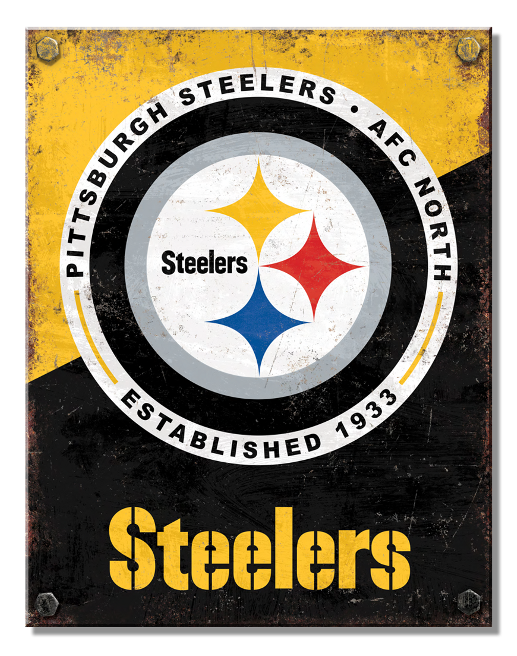 This is a Pittsburgh Steelers tin sign. This is a vertical/portrait.