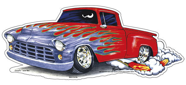 This is a quality metal sign that has a unique character illustration that would add character to your garage. This sign measures 22.5" x 10". This is a unique 1955 Chevy Truck that has vivid coloring.