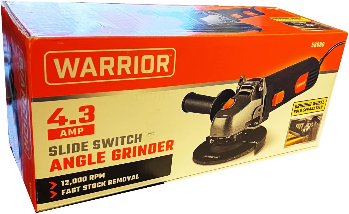 The WARRIOR™ 4.3 Amp, 4-1/2 in. Angle Grinder quickly removes stock for efficient shaping, grinding and metal cutting. The 4-1/2 in. angle grinder has a 4.3 amp motor that delivers 12,000 RPM and features a rugged aluminum gear case to withstand rigorous use in the shop or garage. The two-position auxiliary handle adjusts to left or right hand use.